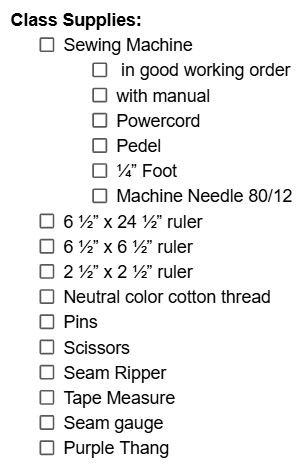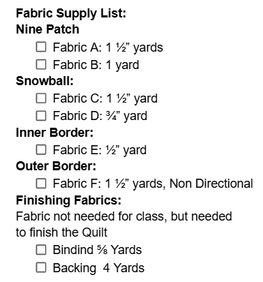 | Skill Details: | A skill level between Quilting 101 and Quilting 102. |