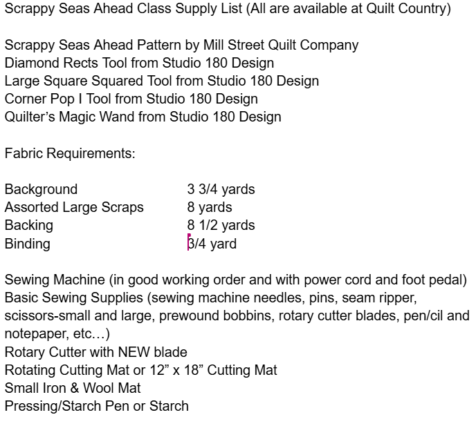 - Quilt Country is not responsible for the loss of or damage to students’ personal items.